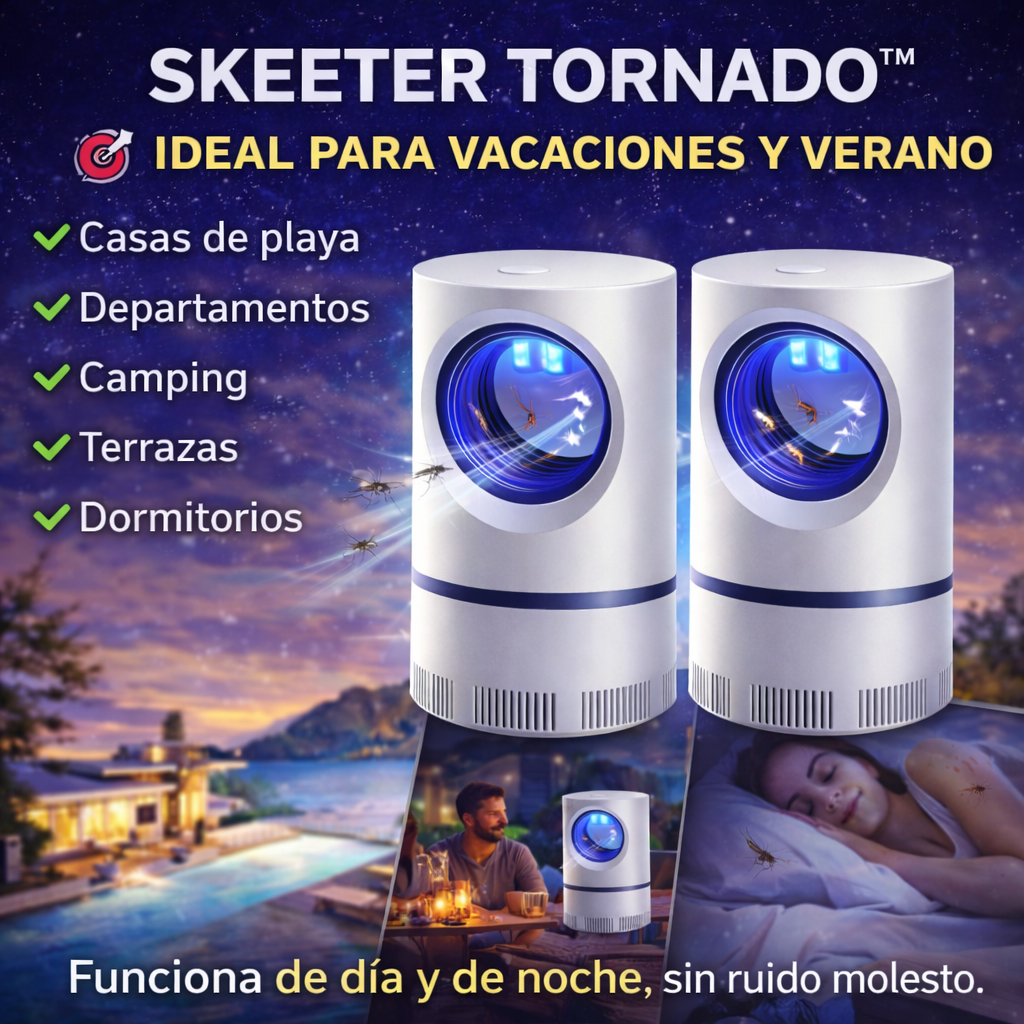 SKEETER TORNADO™ atrae y elimina mosquitos con luz UV y succión silenciosa, protegiendo a tu familia sin sprays, sin olores y sin venenos.
